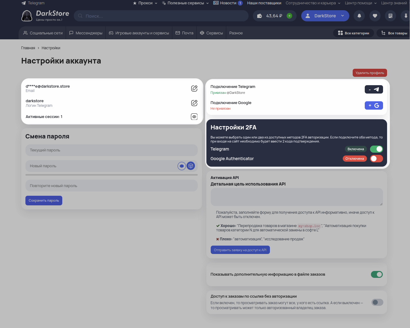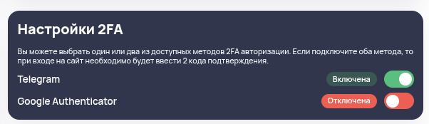 Установить дополнительную защиту 2FA на ваш аккаунт Вы можете на странице настроек аккаунта.
